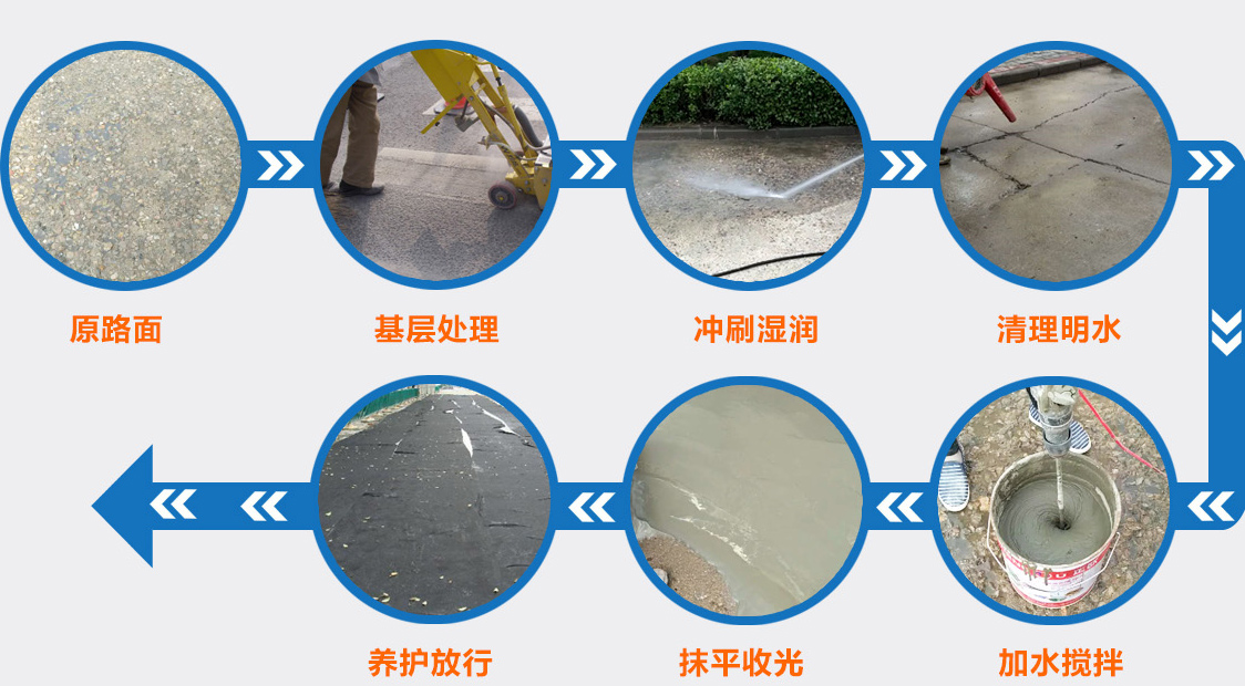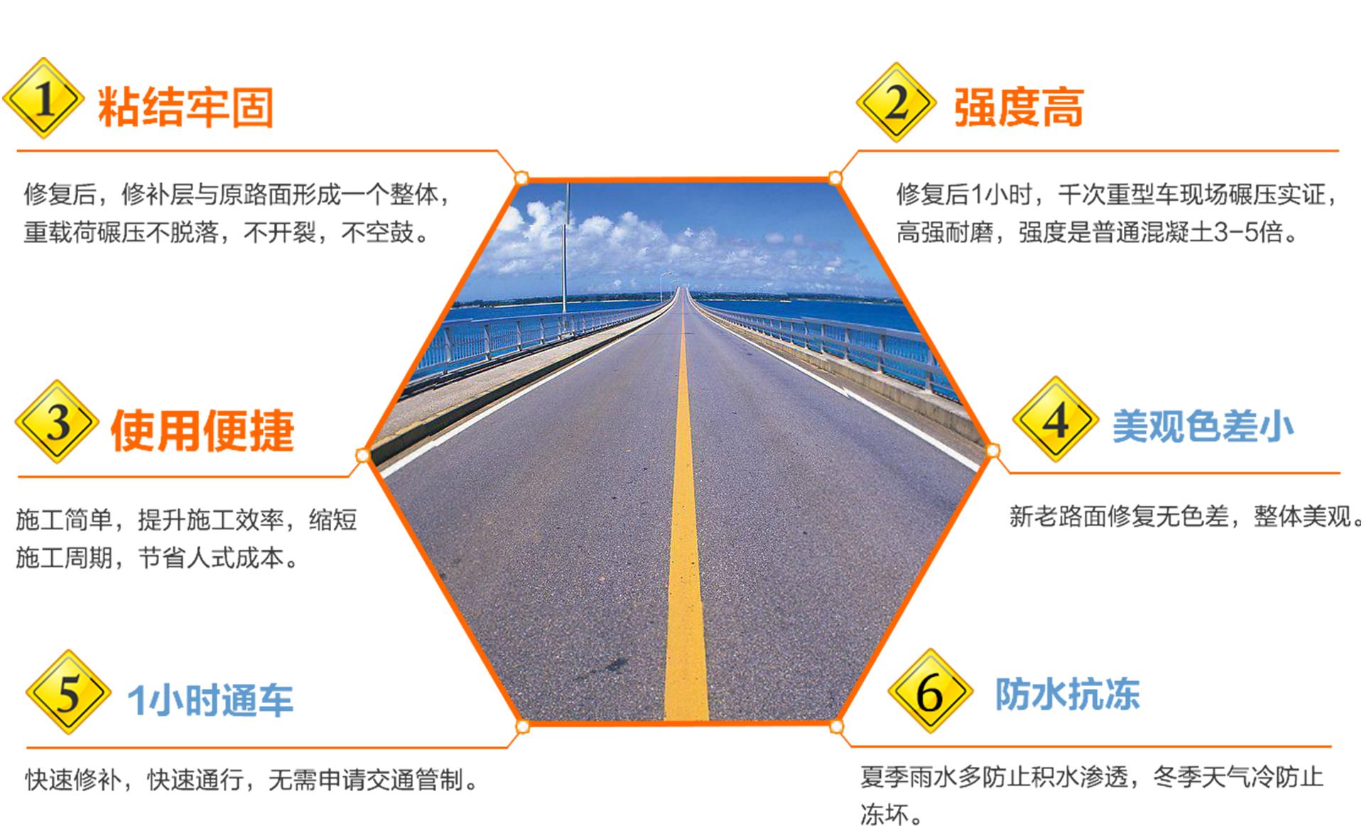 高聚物混凝土道路快速修補料分薄層修補、深層修補、墻面修補,是由多種無機與高分子材料組成的一種反應型快速修補材料,具有快硬、早強、高強、抗滲、抗裂、耐磨、耐久等多種功能,與新、老混凝土粘結牢固,施工簡便等特點,其抗壓強度和抗折強度大大高于普通混凝土的強度。