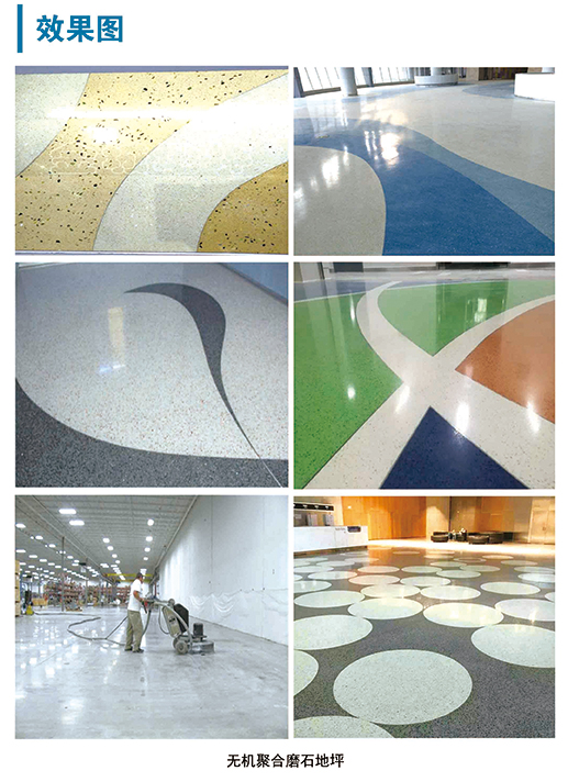 無機聚合磨石地坪材料是由多種無機與高分子材料組成的一種反應型地坪材料,具有早強、高強、抗滲、抗裂、耐磨、耐久等多種功能,將碎石、玻璃、石英石或彩石等骨料拌入鋪攤找平,經機械和人士進行表面研磨處理、 密封固化、打磨拋光的制成品。